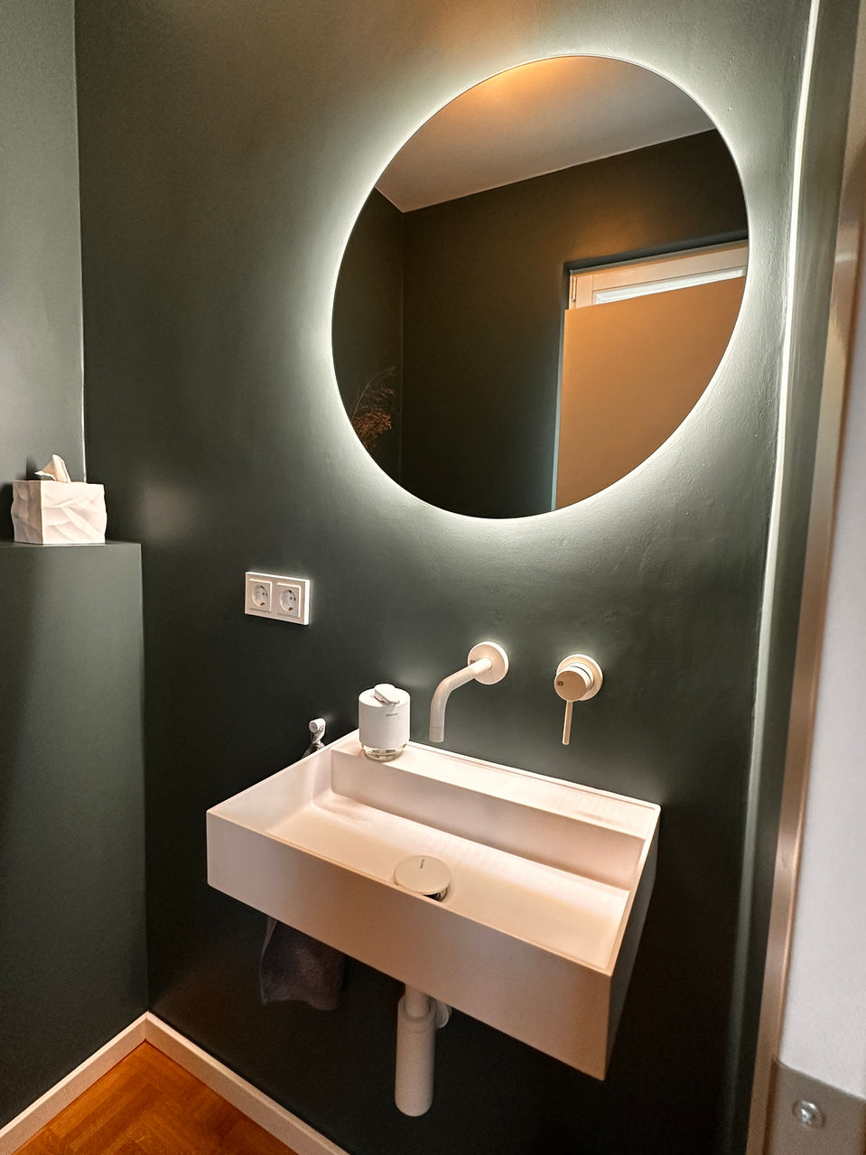 Handgespachtelte Bäder mit hochwertigen Sanitäranlagen von Vallone und Gessi. Das Masterbad verfügt über eine Badewanne, insgesamt gibt es 3 Duschen im Haus.